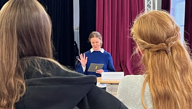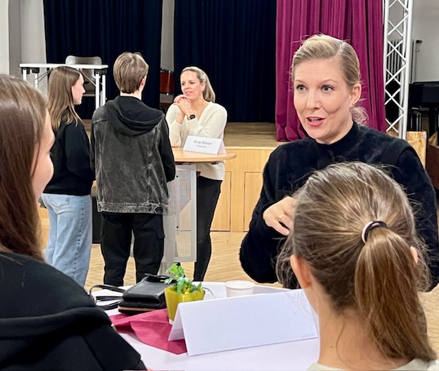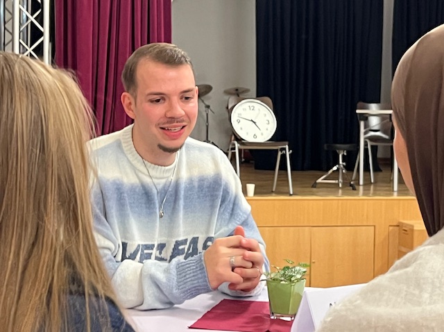 Nachmittags trafen wir uns in der Aula des MCG in bunt gemischter Berufe-Runde mit Schülerinnen und Schülern der Oberstufe. Neu in diesem Jahr war ein informativer Einstiegsvortrag über die Does and Don‘ts bei