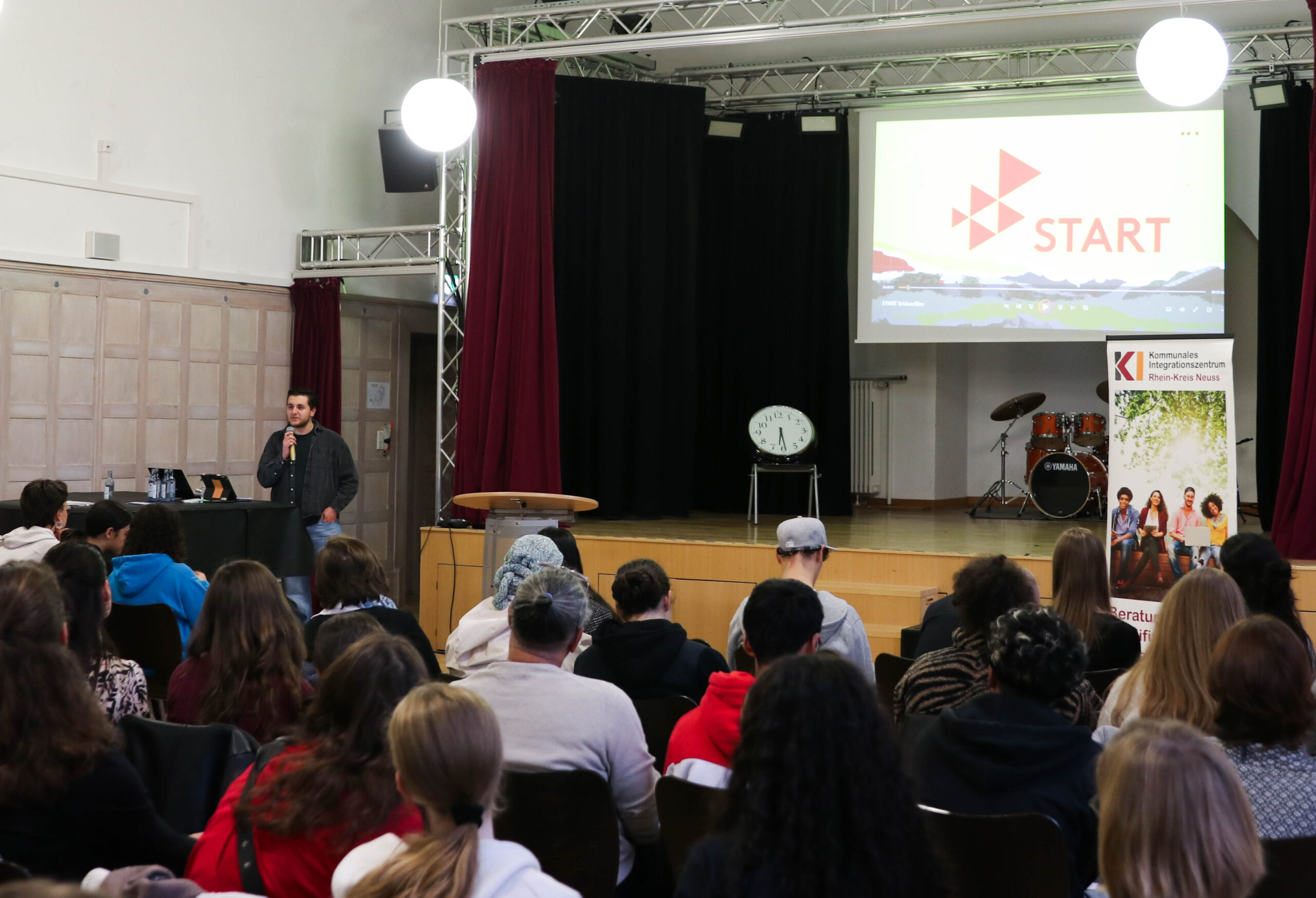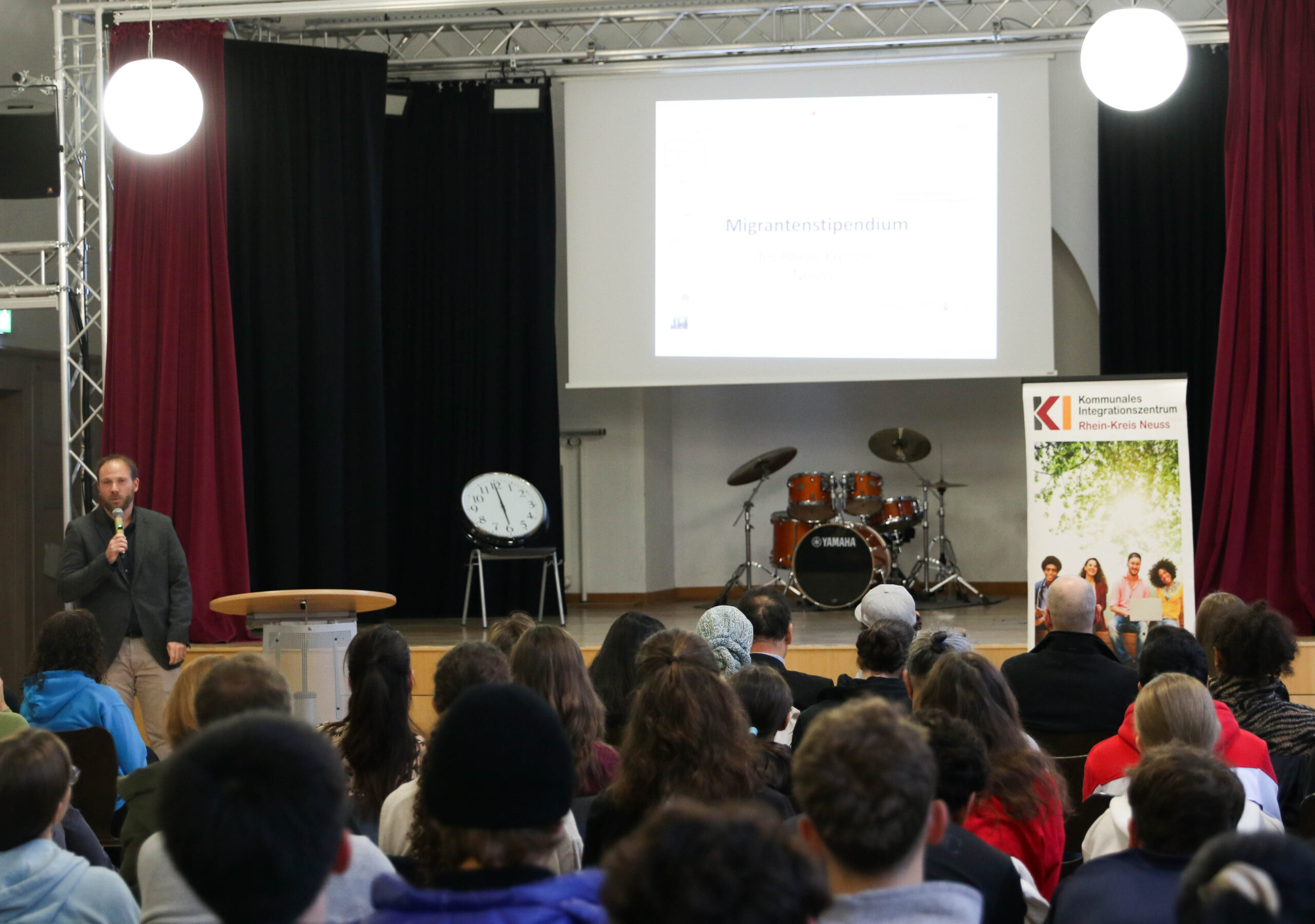 Dazu hatte das MCG in Zusammenarbeit mit dem Kommunalen Integrationszentrum des Rhein-Kreis-Neuss diverse Gäste eingeladen. Stipendiaten diverser Stiftungen stellten in kurzen Vorträgen die Leitlinien ihrer Stiftungen und das Bewerbungsverfahren vor. Anschließend nutzten die zahlreichen Schülerinnen und Schüler und Eltern die Möglichkeit, sich in kleiner Runde bei Snacks und Getränken mit den Stipendiaten auszutauschen. MCG-Referendar Luca Demirel, der das Deutschland-Stipendium vorstellte, war ein besonders gefragter Gesprächspartner, der sogar seine eigenen Bewerbungsunterlagen als Anschauungsmaterial mitgebracht hatte. Auch Aras Ali, Vertreter des START-Stipendiums für Jugendliche mit Migrationshintergrund, wurde von vielen Interessenten umringt.