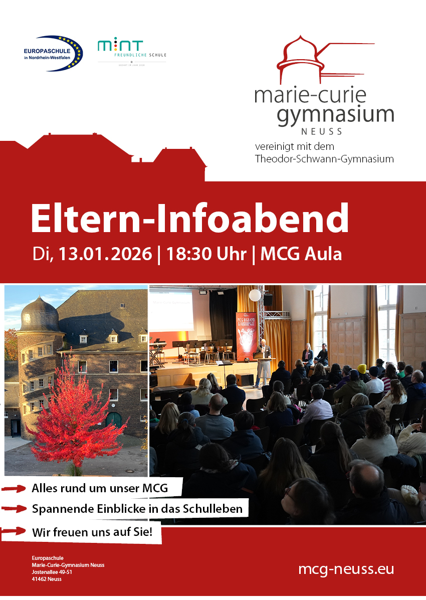 Wir laden alle interessierten Eltern und Schüler:innen herzlich zu unserem Informationsabend am Marie-Curie-Gymnasium ein. Unser Schulprogramm und das vielfältige Angebot werden Ihnen von engagierten Schüler:innen vorgestellt. Wir freuen uns auf Ihren Besuch!