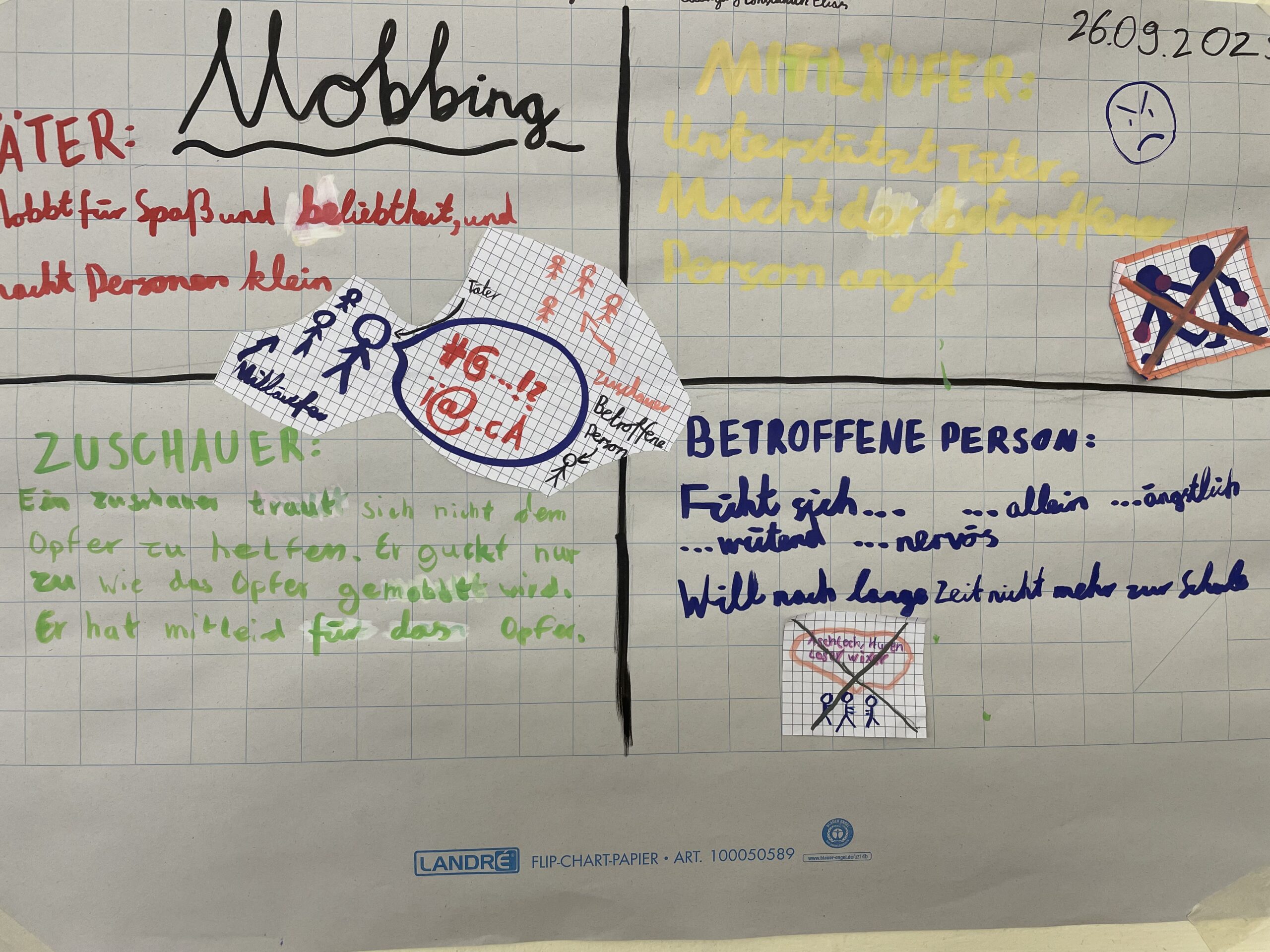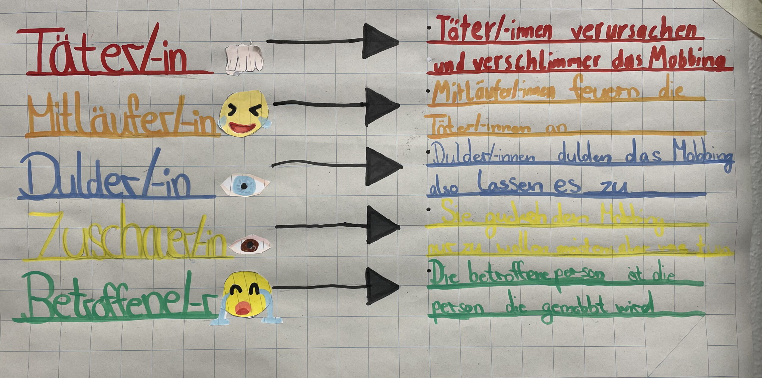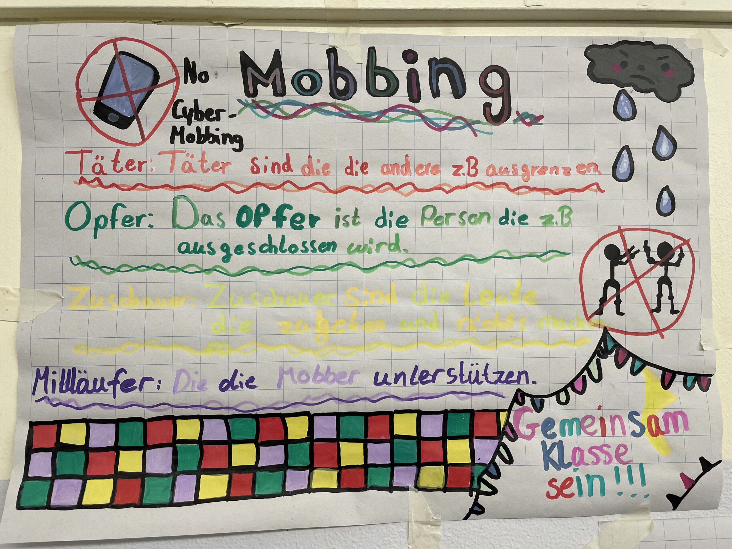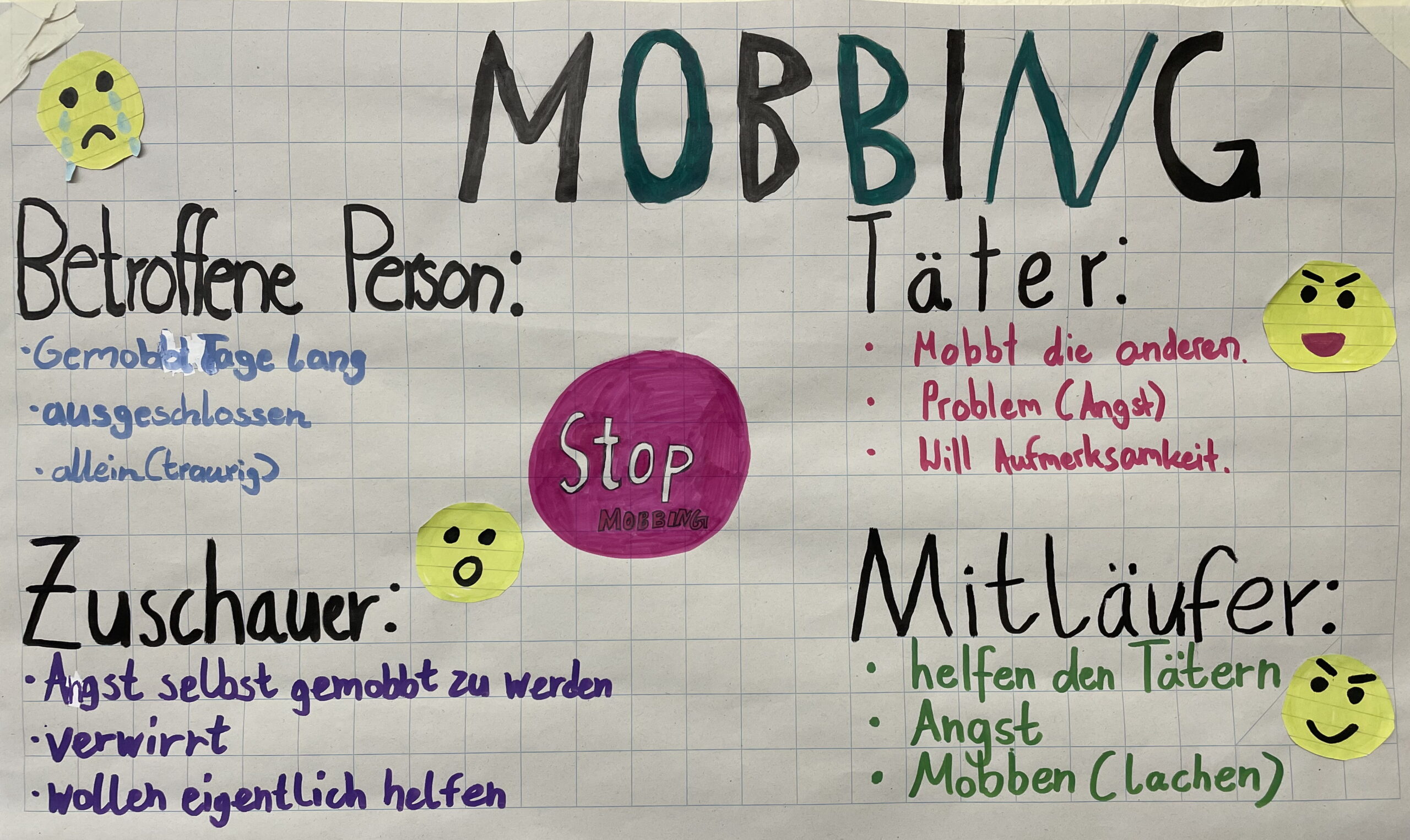 Durch Rollenspiele, das Erstellung von Aufklärungsplakaten und das aktive Positionieren nach dem Hören von Fallbeispielen möchten wir den Schüler:innen vermitteln, dass niemand an Mobbing unbeteiligt ist.