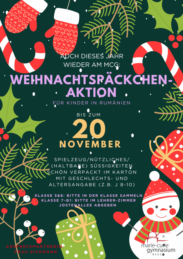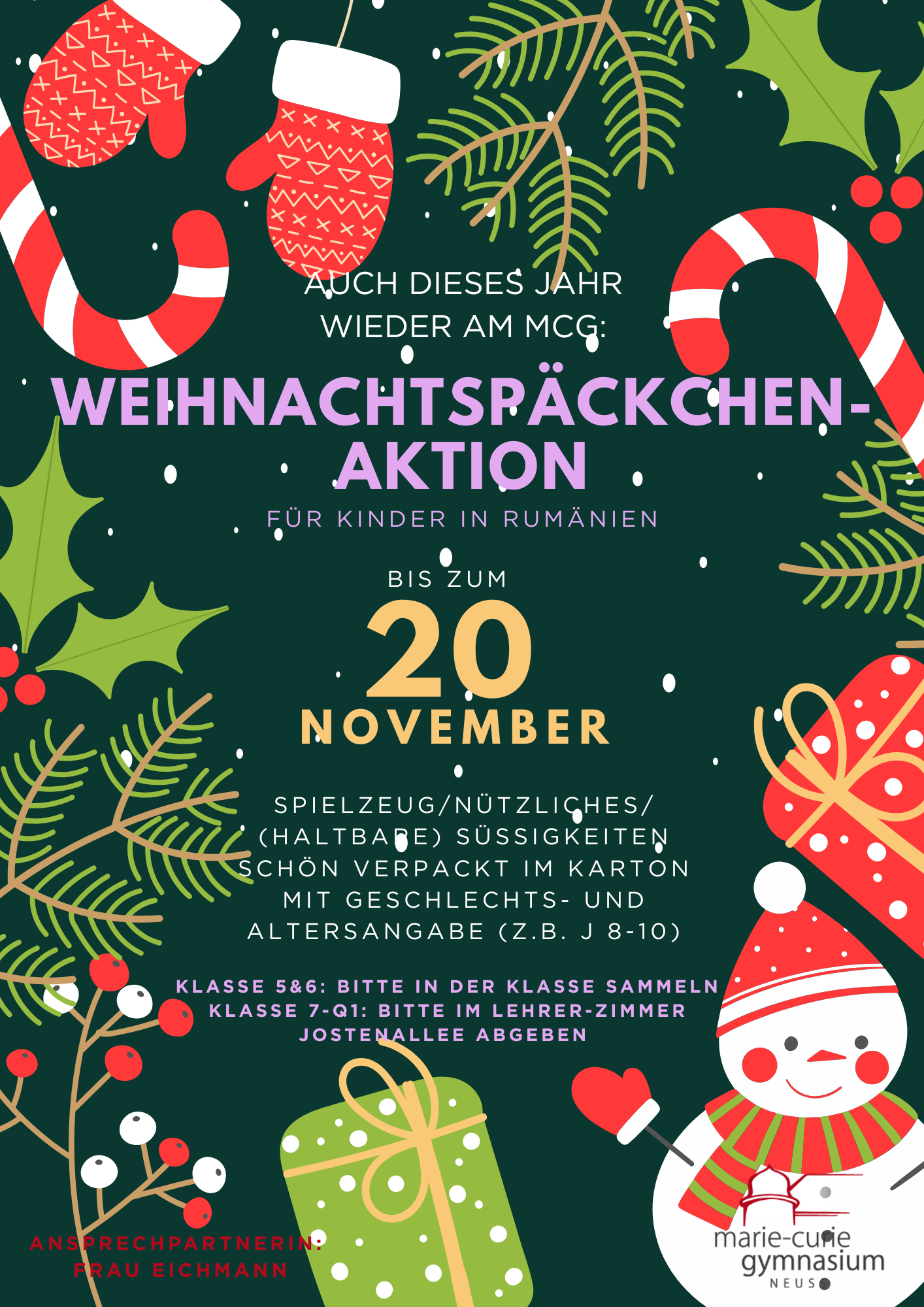 So können Sie mitmachen: Packen Sie gemeinsam mit Ihrem Kind ein schönes Weihnachtspäckchen in einem Schuhkarton. Bitte geben Sie das fertig gepackte Päckchen bis spätestens 20. November bei uns am MCG ab.