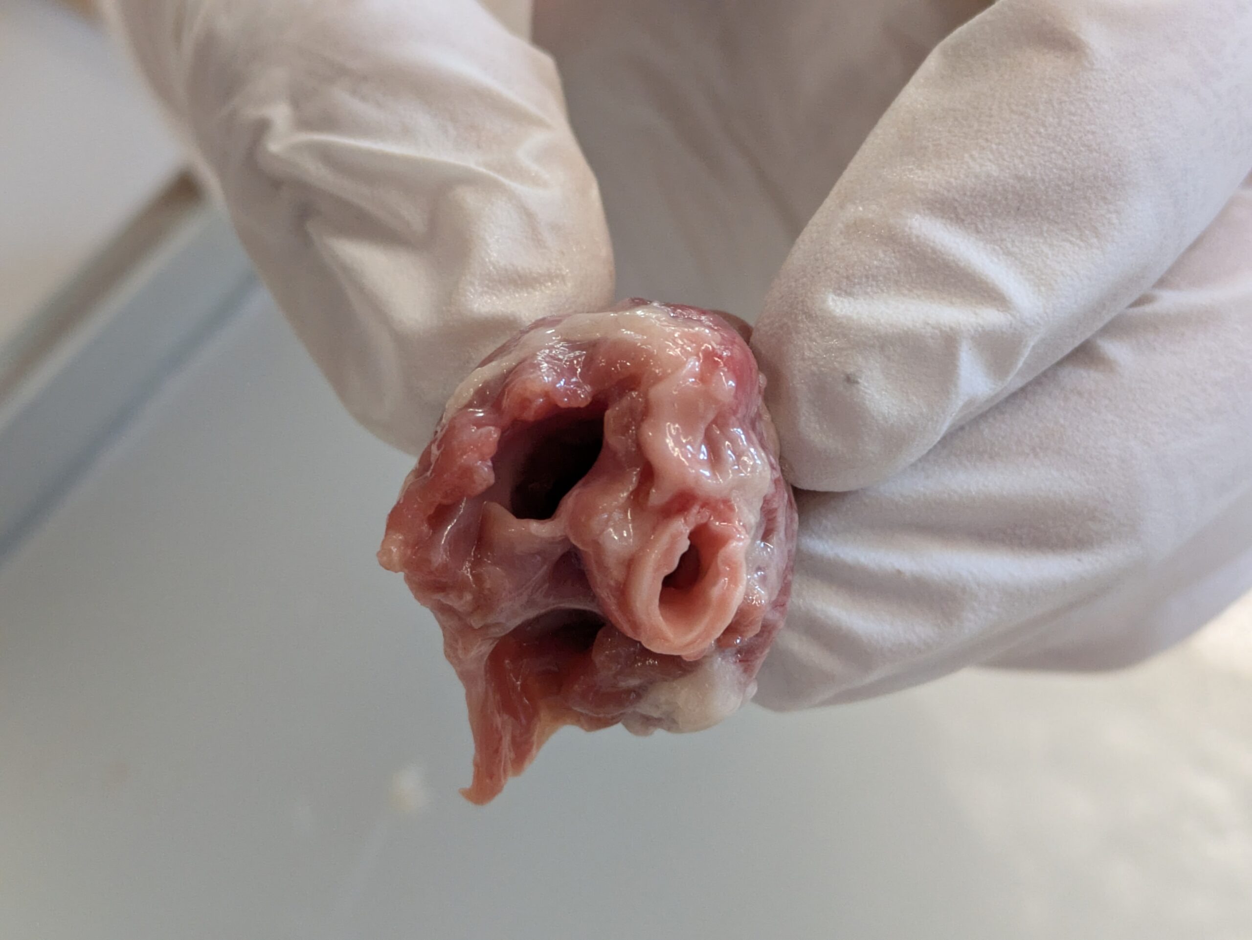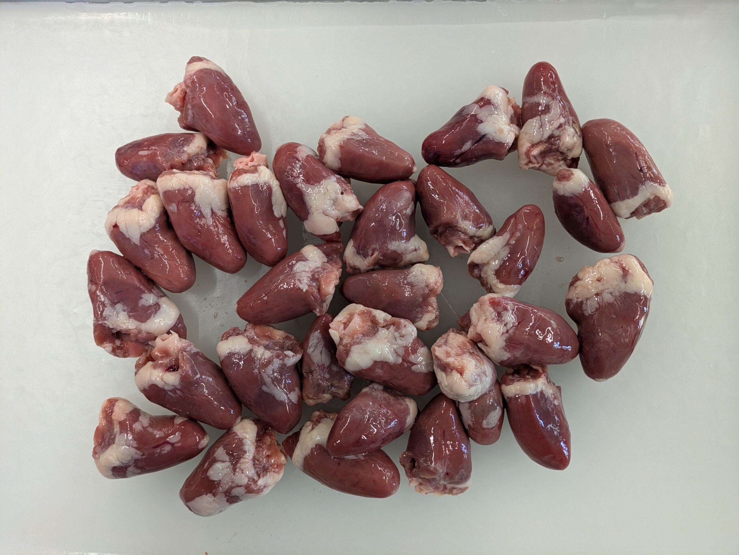 Hühnerherzen bieten den Vorteil, dass sie aufgrund ihrer geringen Größe leicht in der Hand zu halten sind. Auch ungeübten Schüler:innen gelingt der Quer- sowie Längsschnitt ohne größere Schwierigkeiten.