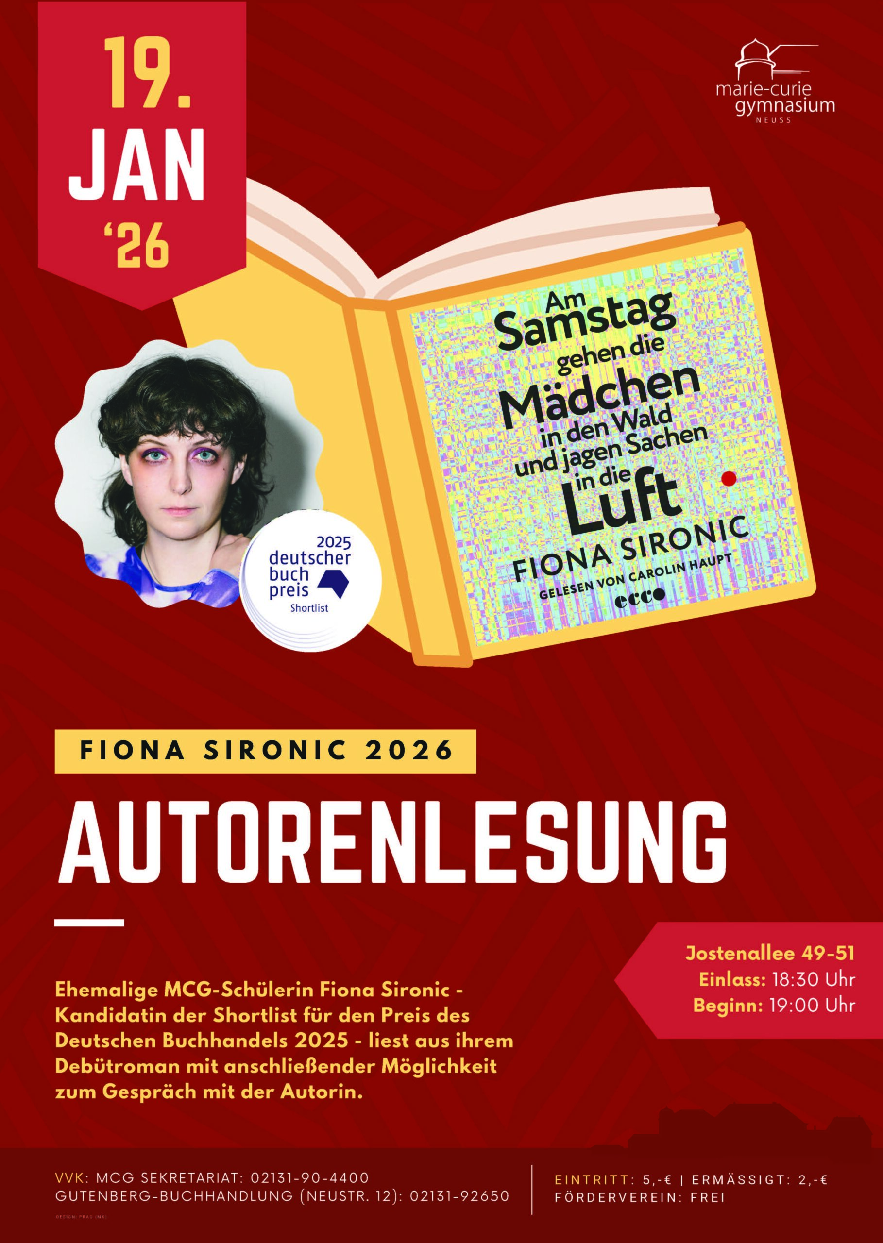 Am 19. Januar 2026 begrüßen wir am Marie-Curie-Gymnasium eine besondere ehemalige Schülerin: Fiona Sironic, Kandidatin der Shortlist für den Deutschen Buchpreis 2025, liest aus ihrem Debütroman „Am Samstag gehen die Mädchen in den Wald und jagen Sachen in die Luft“.